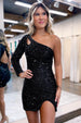 Introducing "Joanna." a homecoming dress that redefines what it means to be breathtaking. Sculpted in a bodycon silhouette that enhances your natural curves. this sequin fabric masterpiece is an epitome of allure. The drama unfolds with a one-shoulder neckline featuring an artistic cut-out. adding a dash of intrigue to a classic design. Your entrance becomes a statement as the long sleeve hugs your arm. making you feel empowered and sexy at the same time. Turning around reveals a keyhole design on the back. offering a sneak-peek into your fearless personality. Finally. the slit serves as the climax of this visual spectacle. elevating the black color of the dress to a hue that speaks volumes.