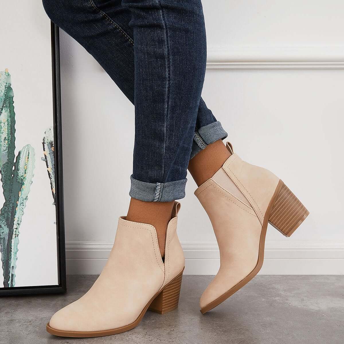 Trendy cutout mid block heel ankle booties for women in cute almond toe. side deep v cutout. back pull-tab.gives you just a little height but remains easy to walk in.