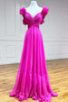 Experience the Aadhya Lace-Up Fuchsia V-Neck Ruffle Pleated Long Prom Dress. a stunning blend of modern femininity. This exquisite chiffon dress is available in yellow. white. fuchsia. and sky blue. Its A-line silhouette cascades to floor length. featuring a sweep train and V-neckline for a flattering and alluring look. Pleating detail adds texture and depth while the lace-up back ensures a customizable fit. Perfect for prom. formal gatherings. or special events. the Aadhya dress exudes style and poise.