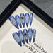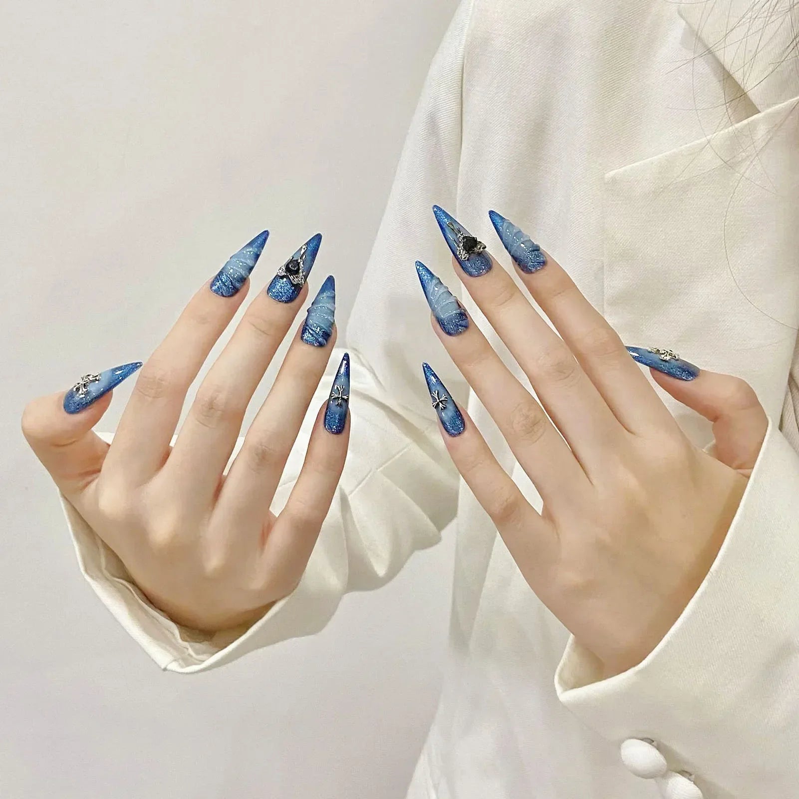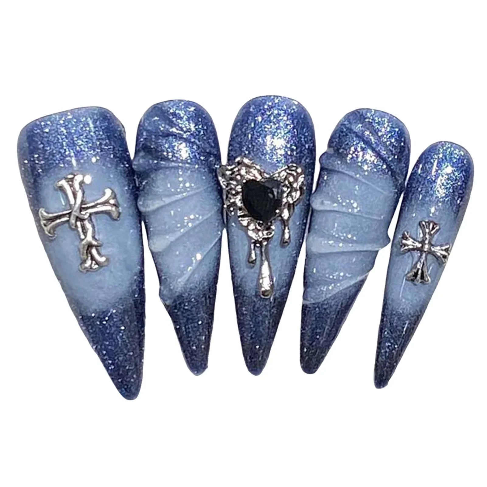 10pcs Flash Blue Press On Nails Handmade Long Stiletto False Nail Tips With Metal Heart 3D Water Ripple Designs Fake Nail Art