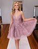Make your grand entrance with Bianca. our A-Line Applique Wisteria Homecoming Dress. Cut from sparkling tulle fabric. this dress is designed to move gracefully with you. capturing attention with every step you take. From the deep V-neckline to the criss-cross open back. every detail of the dress Bianca is meticulously crafted. The spaghetti straps add a delicate touch to the ensemble. while the lace appliques offer intricate detail. Each applique is thoughtfully placed. adding a layer of sophistication and allure to the dress.