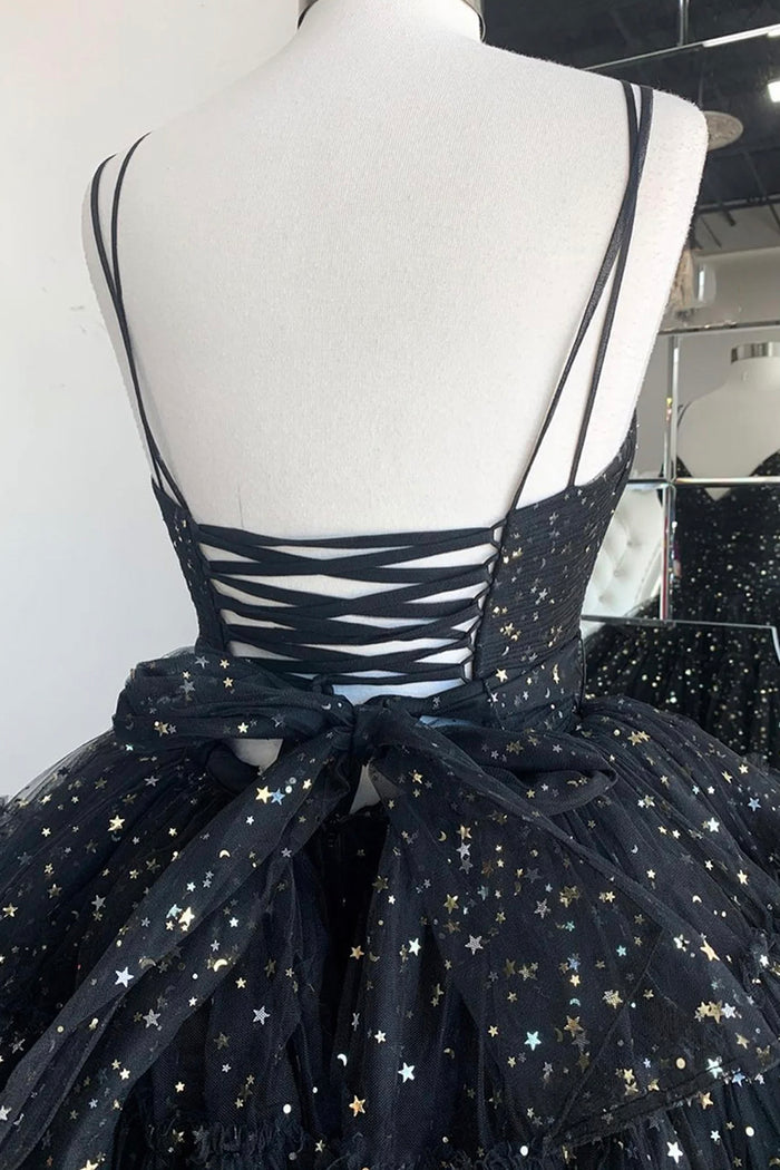 Make a celestial entrance with "Nathalia." This A-line high-low dress is your ticket to standing out from the crowd. Crafted from star-pattern sequined tulle fabric. Nathalia shimmers like the night sky. embodying the mystery and allure of the cosmos. The spaghetti-strap and V-neck neckline offer a touch of romance. allowing for an exquisite show of collarbones and shoulders. Its multi-tiered skirt flows gracefully. capturing the essence of cascading stardust. while the sweep train ensures every exit is as memorable as your entrance. Completing its luxurious design is the lace-up back. ensuring a fit as perfect as the constellation patterns it celebrates.