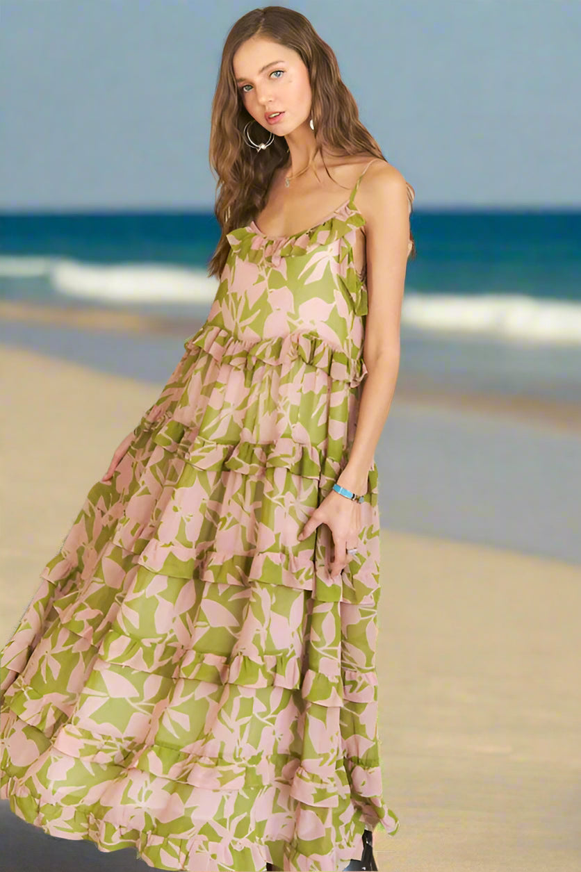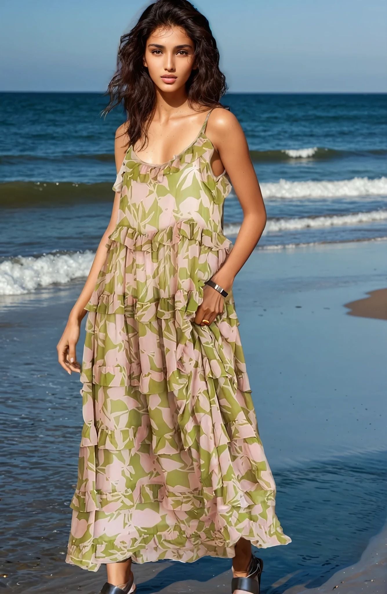 A Ruffled Tiered Scoop Neck Cami Dress is a charming and feminine piece for your wardrobe. The scoop neckline adds a flattering touch to this romantic beach maxi dress. while the ruffled tiers create a playful and romantic look. The cami-style design is perfect for warm weather. offering a breezy and comfortable feel. This dress is ideal for casual outings. date nights. or summer parties. and can be styled with sandals or wedges for a chic and effortless ensemble.