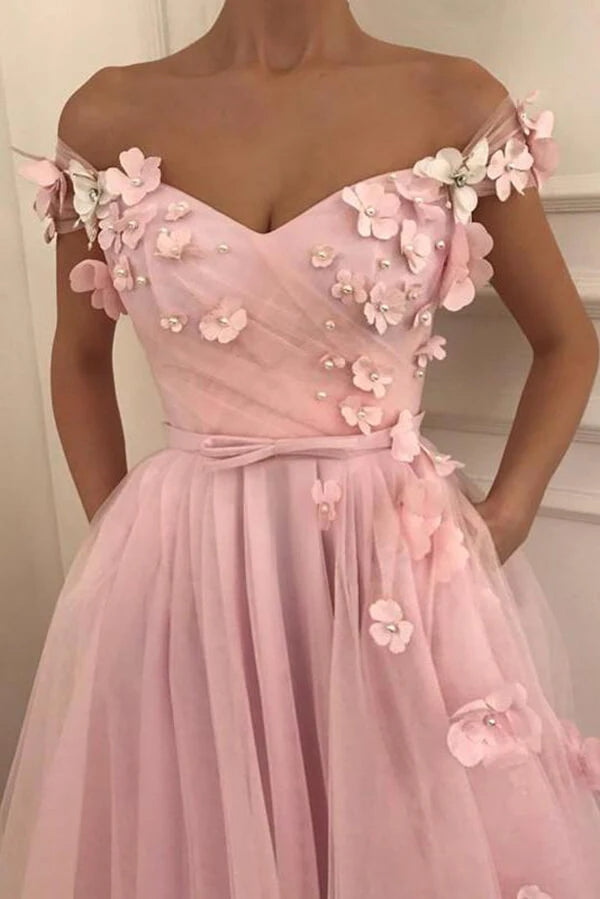 Beautiful Tulle A-line Off-the-Shoulder Long Prom Dresses With 3D Flowers. MP651