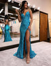 Meet Miracle. an embodiment of dazzling allure. gleaming in every movement with its sequin fabric. This mermaid-style masterpiece. in radiant orange. features a daring deep V neckline. accentuated by delicate spaghetti straps leading to a stunning open back. The slit is gracefully adorned with intricate 3D appliques. mirroring the embellishments on the top part and on the edges of the daring slit. creating harmonious visual intrigue. The floor-length design concludes with a sweep train. leaving a trail of glamour.