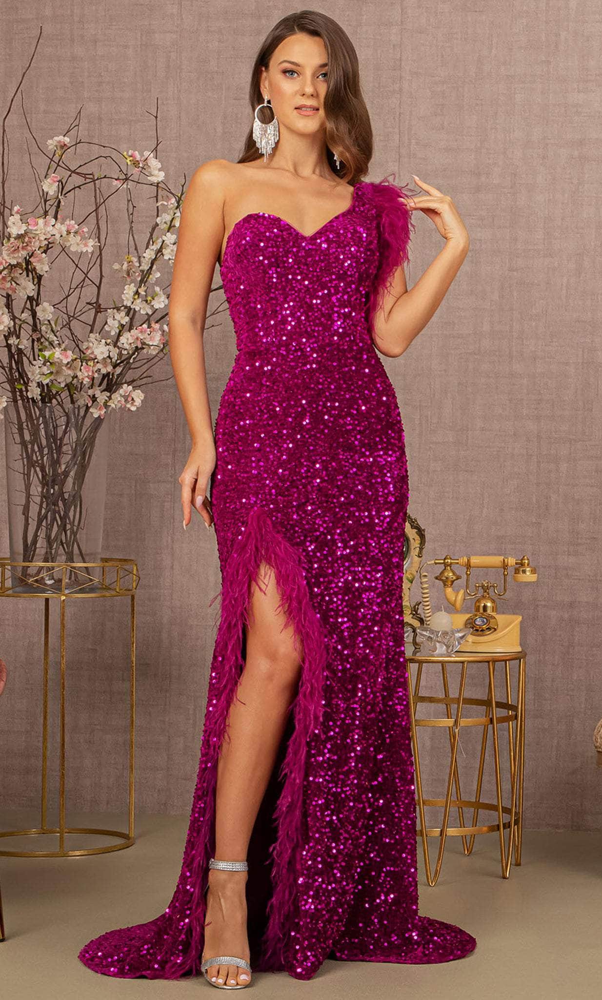 Turn yourself into a head-turning sensation by slipping into this utterly fetching GLS by Gloria GL3154 design. Fashions an asymmetrical neckline with a one-sleeve fitted bodice. this dress adorns in full sparkling sequins and is detailed with feathers in the one-shoulder sleeve and the slit. The back has a zipper closure while it flaunts an alluring mid-open back. From the waist flourishes a sheath silhouette with a thigh-high leg slit and a sweep train finish for added drama. With this graceful beauty from the GLS by Gloria GL3154 masterpiece. you can ensure that the special occasion is one to remember. Models are wearing Magenta and Navy colors.