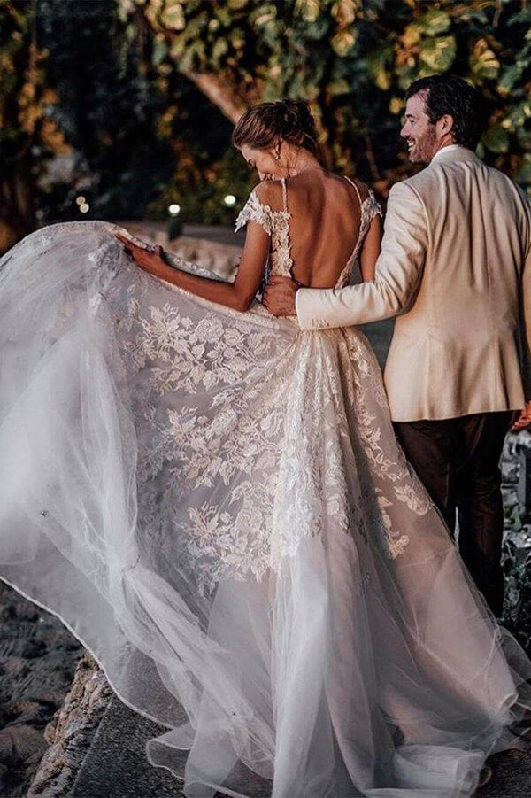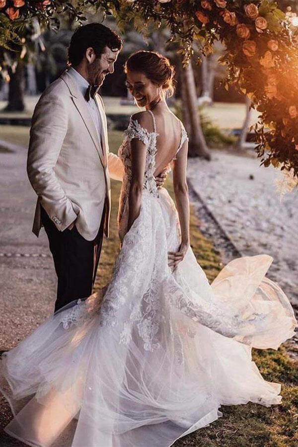Gorgeous Tulle Mermaid Cap Sleeves Lace Appliqued Wedding Dresses.