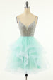Immerse yourself in the enchantment of the "Amelia" - A Line V Neck Tulle Homecoming Dress. an embodiment of sheer grace and sophistication. Exquisite in its design. the dress features a tulle horse-hair ruffled skirt that elegantly cascades. complementing the luminescence of its sequin top. Each stride you take in this masterpiece exudes an ethereal charm. capturing the very essence of a dreamy evening. The plunging V neckline. enhanced with beaded detailing. showcases a delicate balance of allure and modesty. The dainty beaded spaghetti straps lead to a sensual lace-up back. promising a fit that's as perfect as your evening. To finish. the beaded waistline accentuates your silhouette. ensuring you're the star of every glance and the heartbeat of every memory.