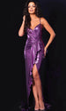 Embrace sophistication with Jovani 43131. a chic sheath gown that radiates timeless elegance. This sleeveless dress features a pleated bodice with a flattering V-neckline. complemented by delicate spaghetti straps. An asymmetrical ruffled waist adds a unique touch. enhancing the figure beautifully. The design is finished with an open V-back and a convenient back zipper. creating a flawless silhouette for any formal occasion. Make an unforgettable entrance and showcase refined style with Jovani 43131. Model is wearing Purple color.