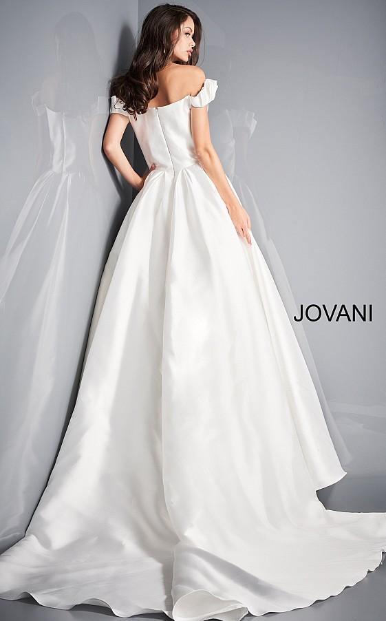 Elegant off shoulder wedding gown highlights pleated bodice V-neckline with trimmed around the waist with pockets and train.