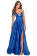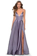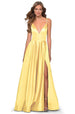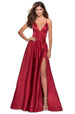 Look timeless in this sleek and chic dress from La Femme 28628. Dazzles in a sleeveless. deep V-neckline with straps connecting to the strappy back. This satin dress flatters with a fitted bodice and from the waist flourishes a full length A-line silhouette with a high leg slit. Be in this gorgeous La Femme creation and leave a lasting impression.