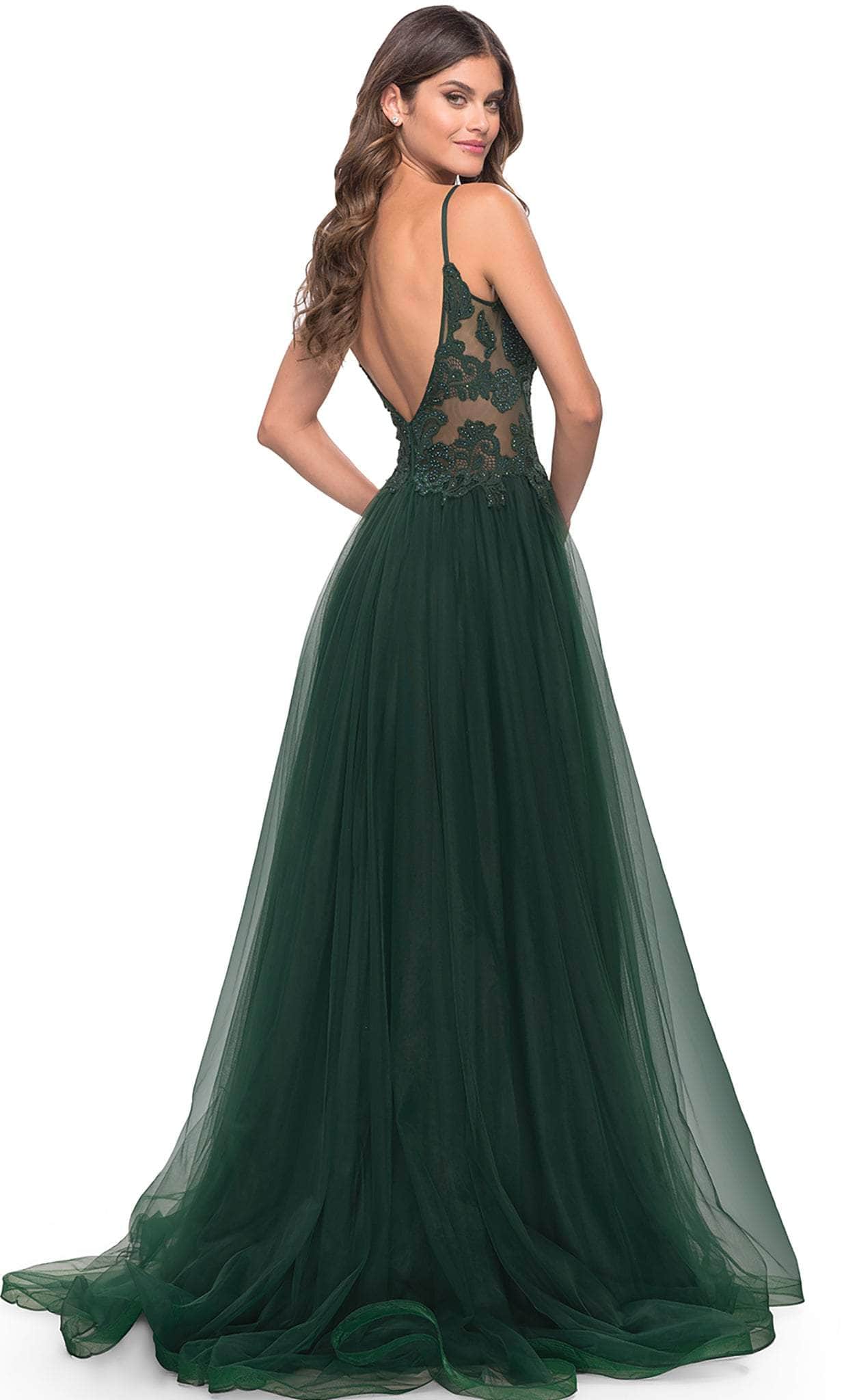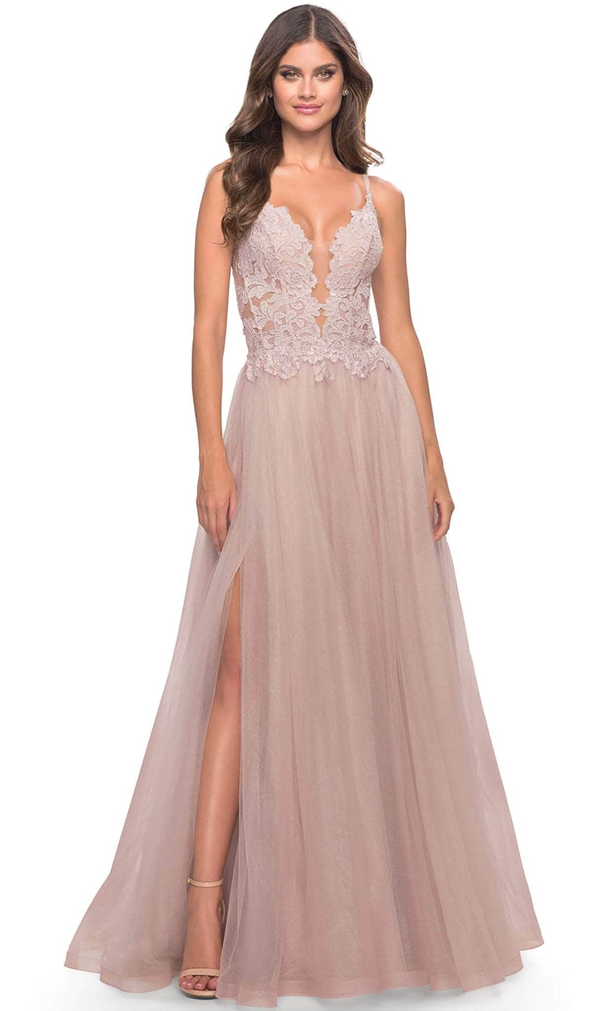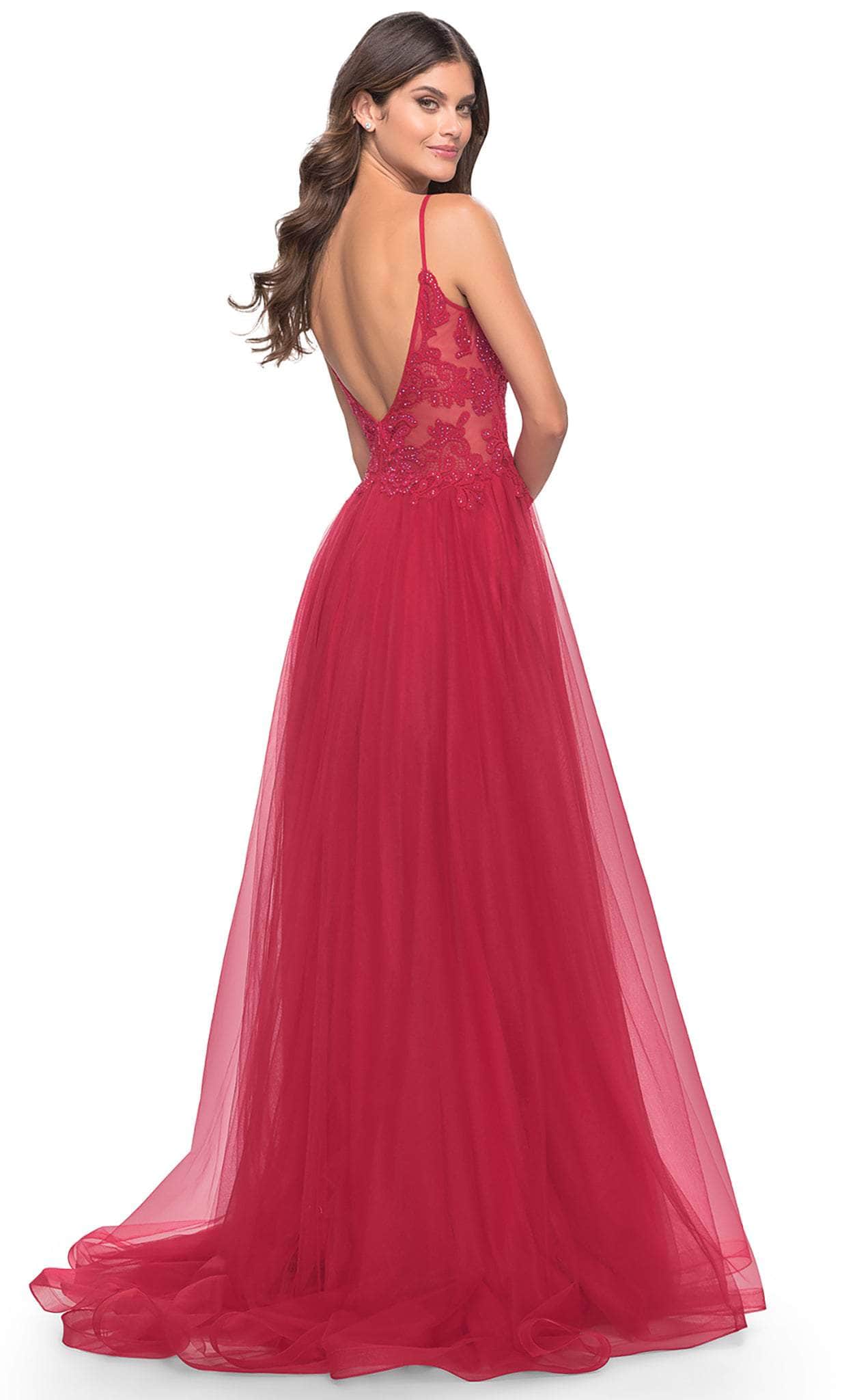 Leave everyone tantalized when you arrive in this tantalizing La Femme 31507 creation. Eloquently designed with sculpting lines and ornamented with floral lace details and rhinestone details. this stunner parades a plunging v-neckline with a sheer inset and spaghetti straps. Designed with an adorned Deep v-open back. the ethereally layered skirt reveals a sexy slit as it pools to the floor with a sweeping denouement. Be destined to shine at your spectacular event in this exceptionally made La Femme masterpiece. Models are wearing the Dark Emerald. Dusty Mauve and Red colors.