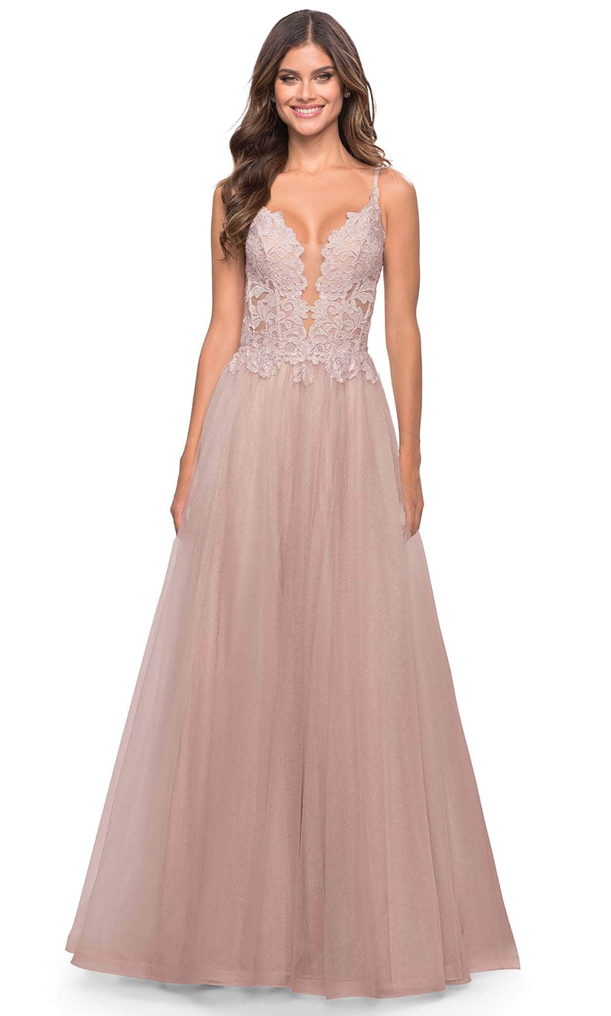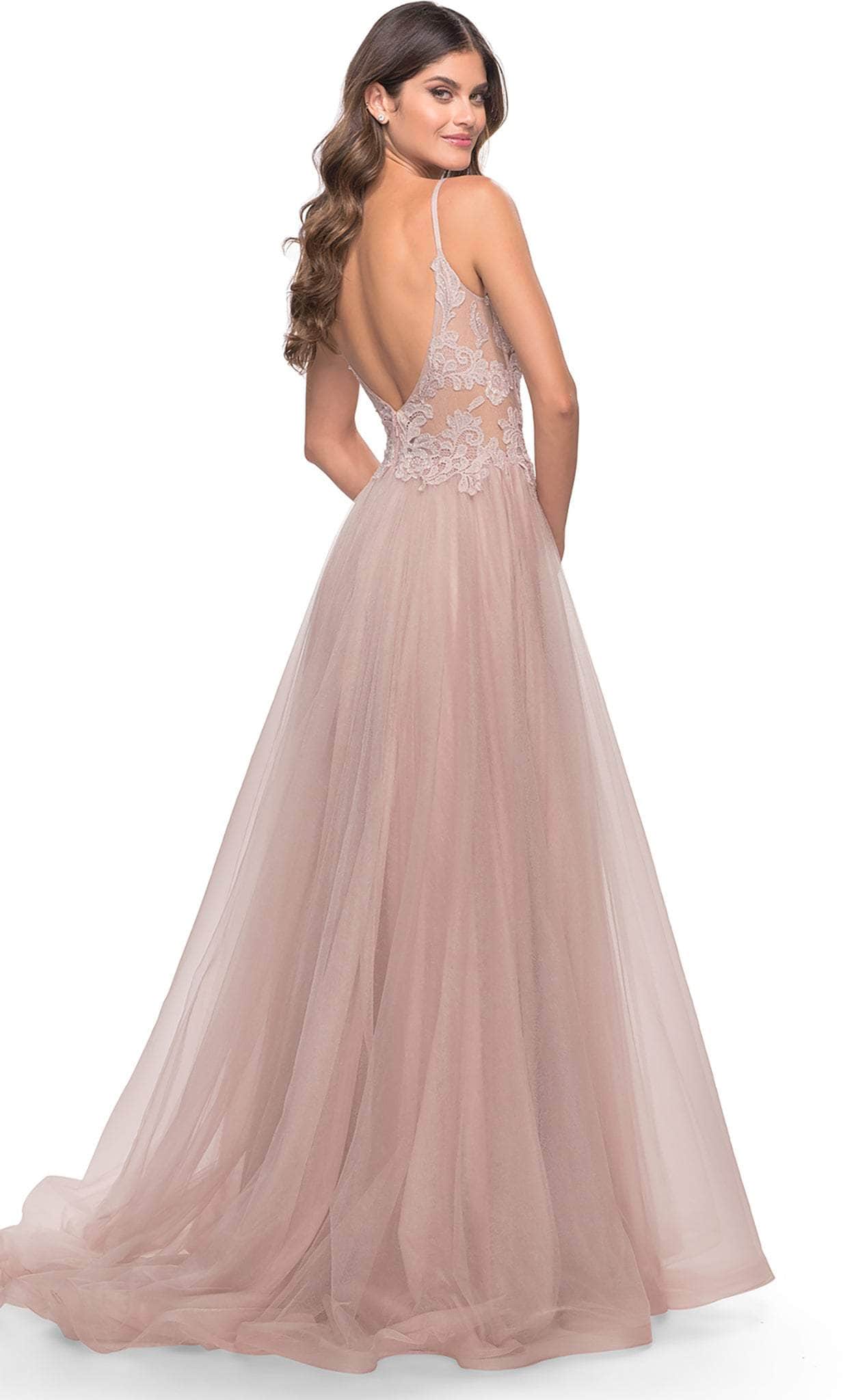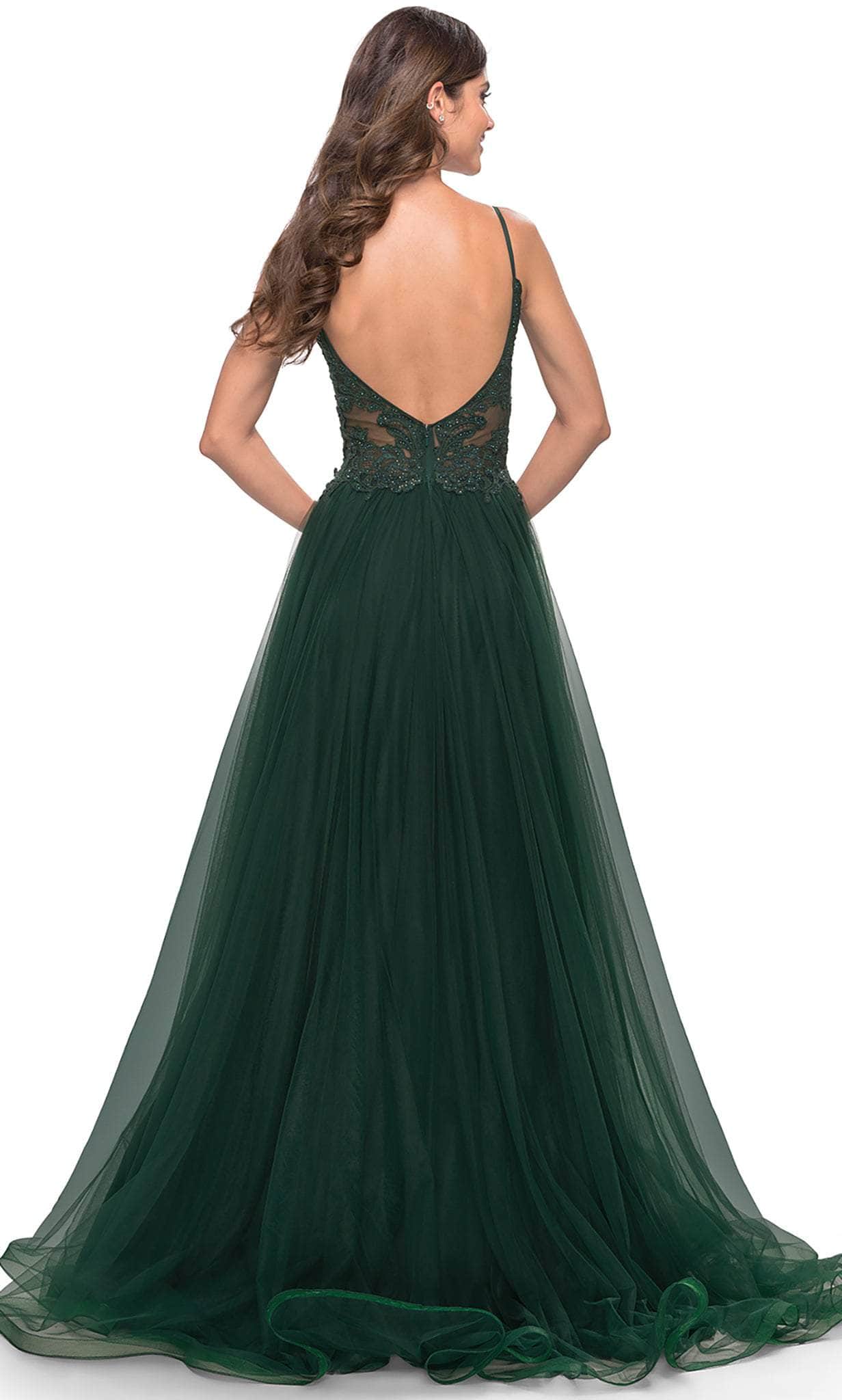 Leave everyone tantalized when you arrive in this tantalizing La Femme 31507 creation. Eloquently designed with sculpting lines and ornamented with floral lace details and rhinestone details. this stunner parades a plunging v-neckline with a sheer inset and spaghetti straps. Designed with an adorned Deep v-open back. the ethereally layered skirt reveals a sexy slit as it pools to the floor with a sweeping denouement. Be destined to shine at your spectacular event in this exceptionally made La Femme masterpiece. Models are wearing the Dark Emerald. Dusty Mauve and Red colors.