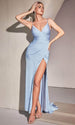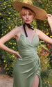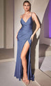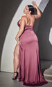 Be the delight of everyones eyes in Ladivine 7494 creation. Look elegant in this faux wrap satin gown with a soft ruching design to accentuate your curves. The sleeveless style features a deep v-neckline supported by adjustable spaghetti straps that go over the mid-open back. A sexy thigh-high slit accents the sheath skirt as it gorgeously flows to a full length hem and sweeping train. This Ladivine 7494 gown is a classic look that works for many special occasions. Models are wearing the Black. Burgundy. Emerald. Mauve. Mauve Rose. Paris Blue. Sage and Smoky Blue colors.