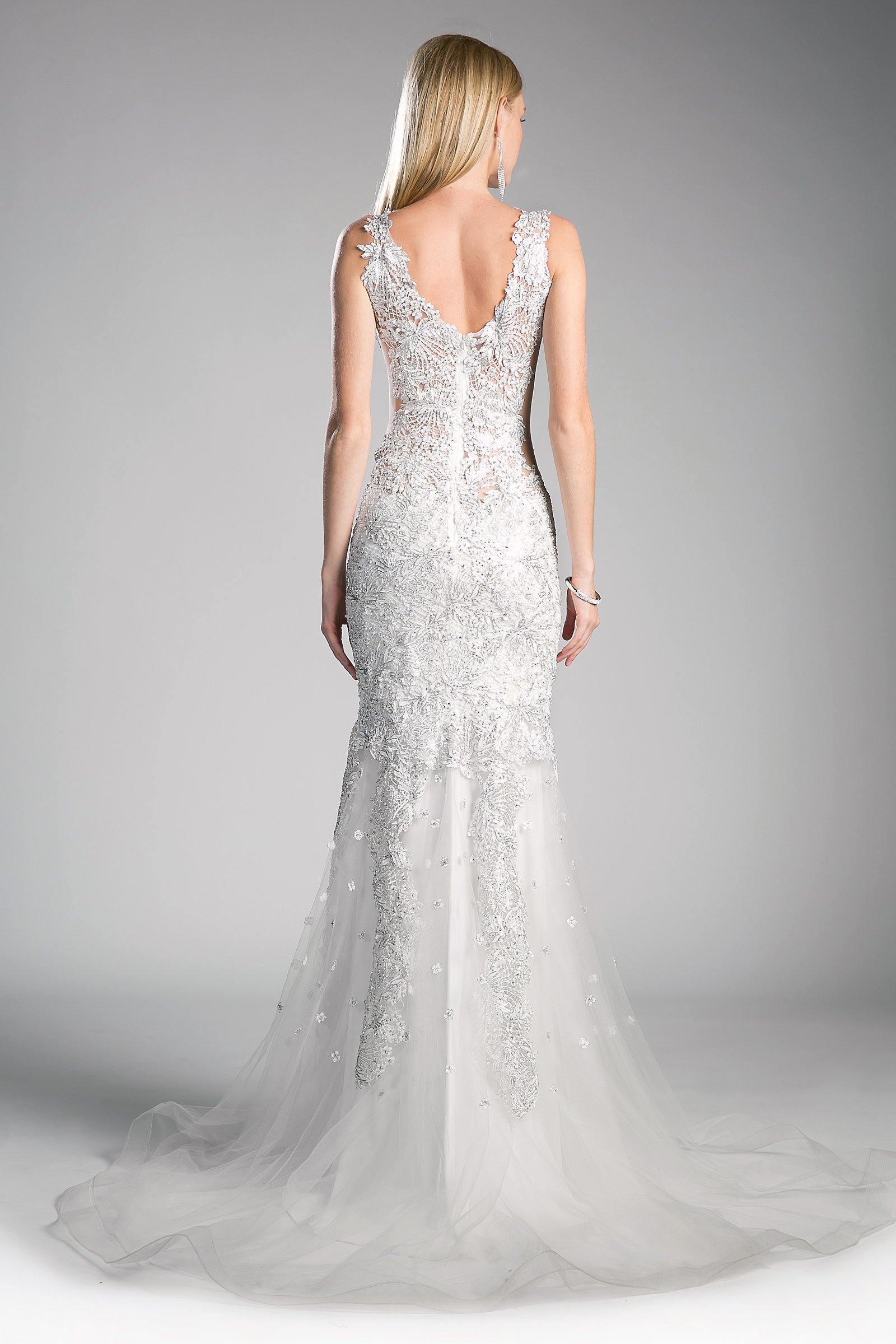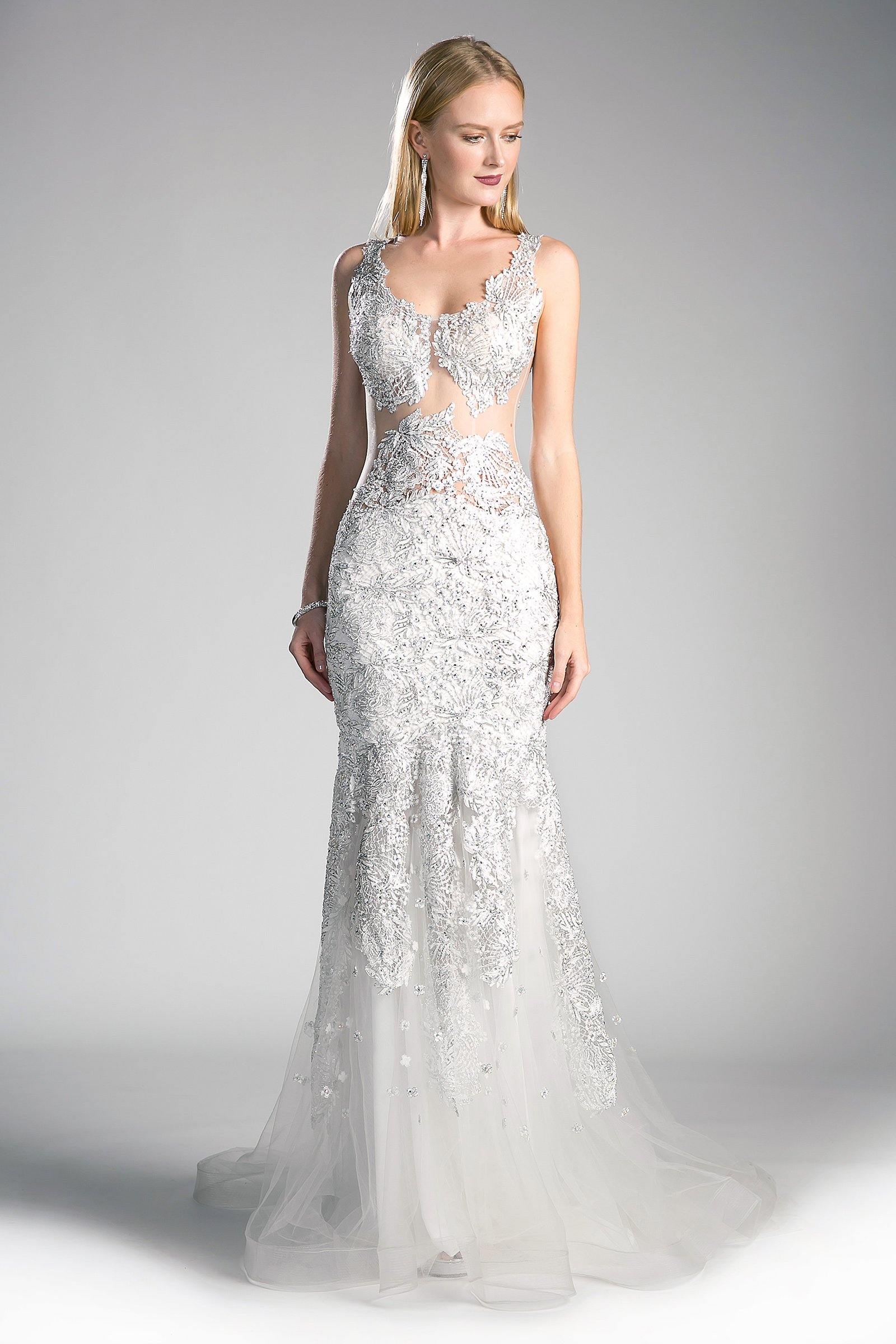 This gorgeous long dress feautures a sleeveless scoop neckline. The bodice is embellished with beaded flower appliques. Fitted design perfect for wedding occasion.