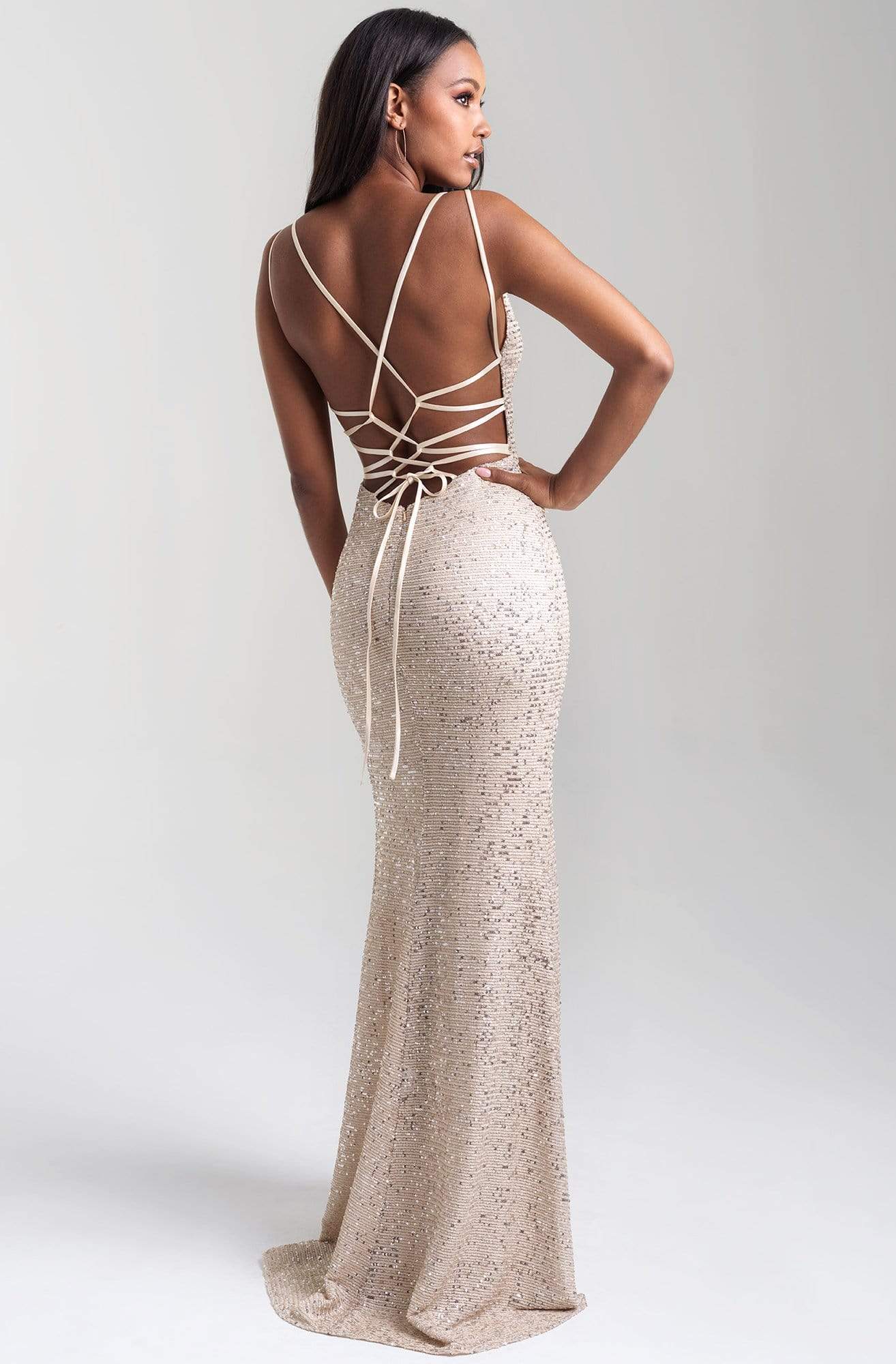 | Details: | Sleeveless. Plunging neckline. Sheer inset. Fitted bodice. Sequins. Strappy back. Sheath skirt. Slit. Sweep train |