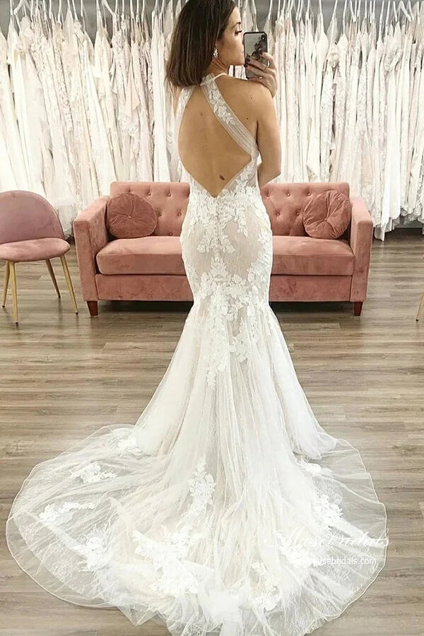 Mermaid Tulle Halter Sleeveless Lace Appliques Wedding Dresses.