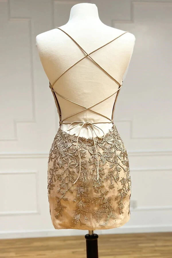 Red Sheath V-neck Spaghetti Straps Lace Tight Mini Homecoming Dresses.