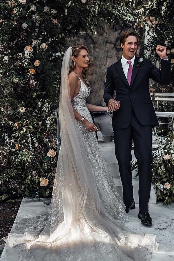 Sparkly Ball Gown V-neck Spaghetti Straps Open Back Sequins Long Wedding Dresses with Train.