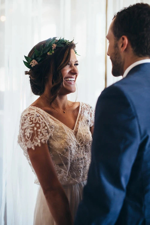 Sparkly Wedding Dresses Romantic A-line V-neck Beading Chiffon Bridal Gown.