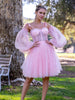 This beautiful pink tulle prom dress is perfect for any formal event! The square neckline and knee-length skirt make it a classic and timeless look. while the long sleeves and ruffles add a touch of femininity.
