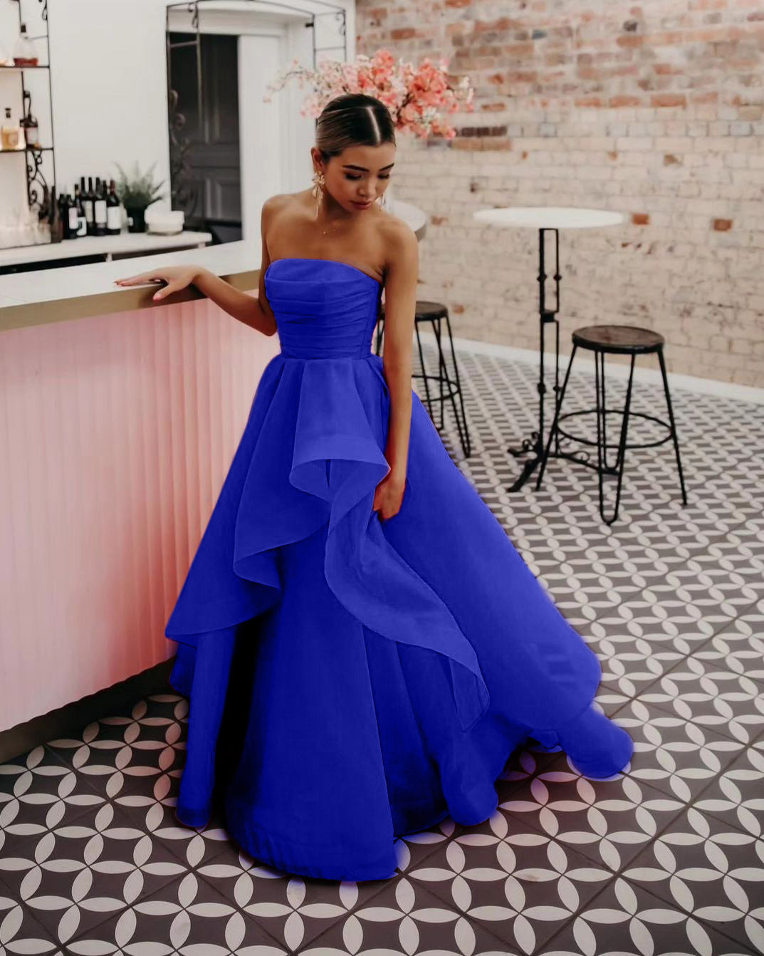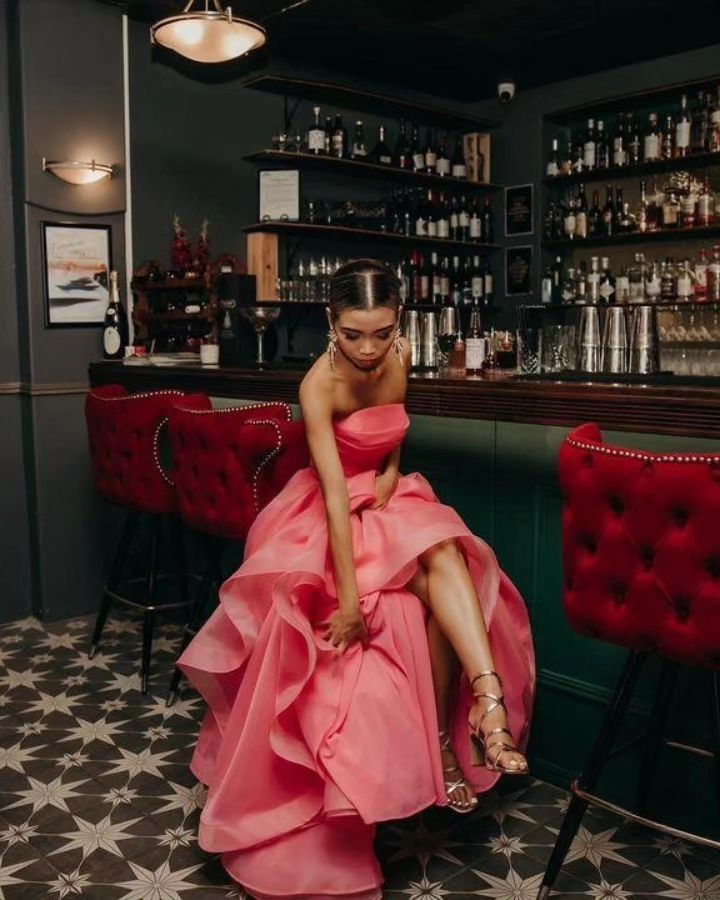 Introducing Elisa. a light pink vision of elegance and softness. This A-line dress is crafted from luxurious organza fabric. imparting an ethereal and graceful flow. The strapless neckline adds a touch of timeless sophistication. perfect for showcasing delicate collarbones and a beautiful necklace. Elisa falls gently to a floor-length train. moving with grace and subtlety. allowing you to float through the room. The horse-hair skirt embellishment adds a whimsical touch. offering a distinctive edge to this stunning piece.Â