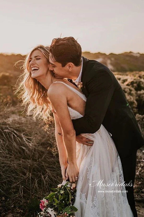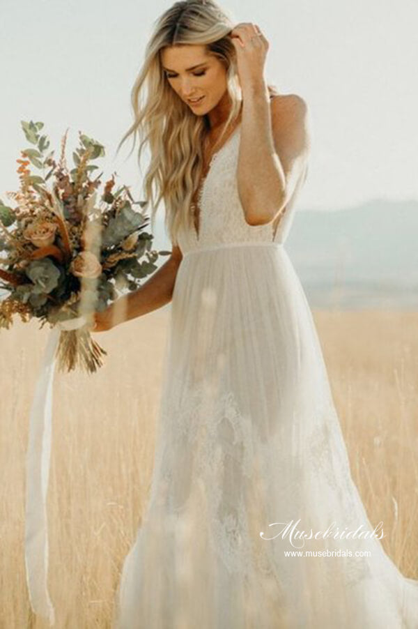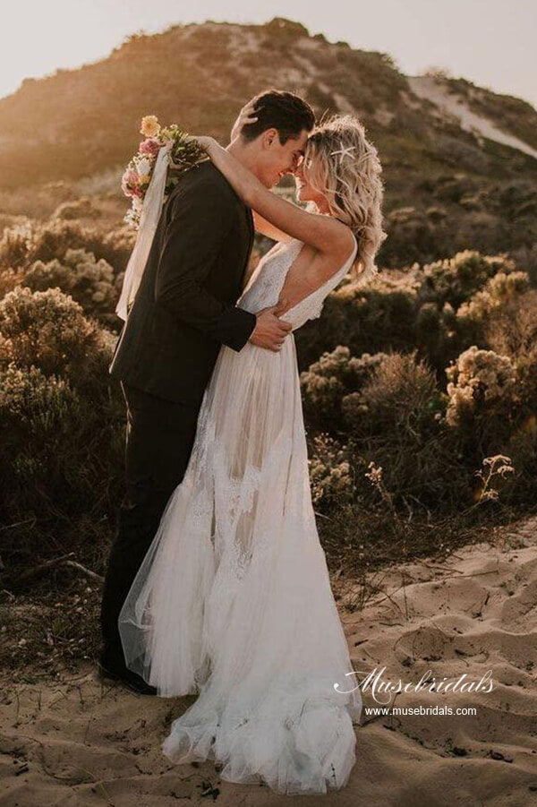 Stunning Tulle A-line V-neck Beach Wedding Dresses With Lace Appliques.