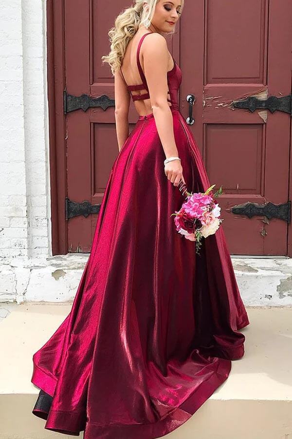 Taffeta A-line Scoop Spaghetti Straps Long Prom Dresses With Pockets.