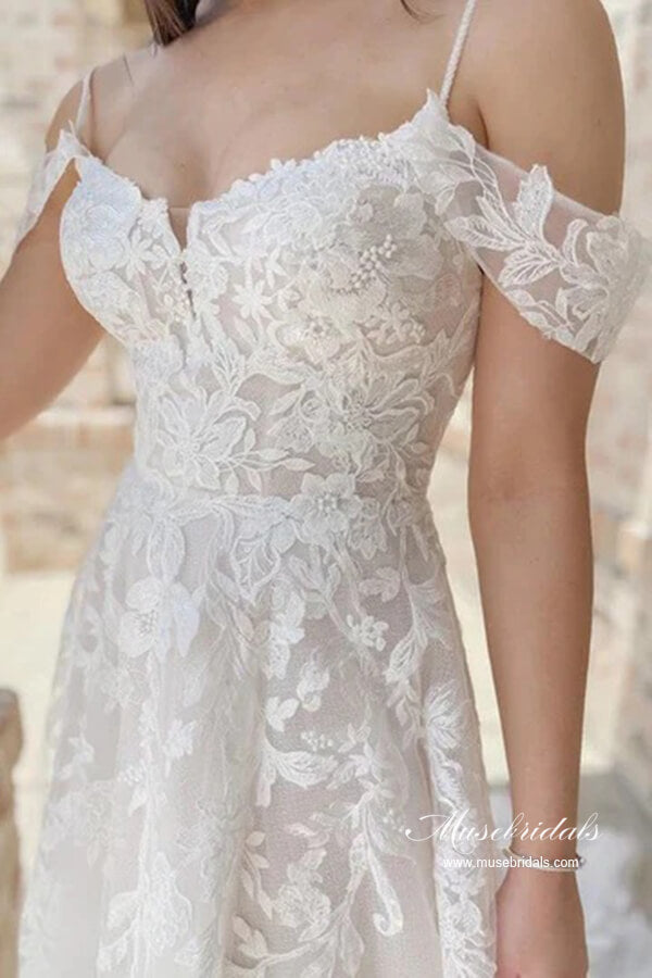 Tulle A-line Cold-Shoulder Wedding Dresses With Lace Appliques.
