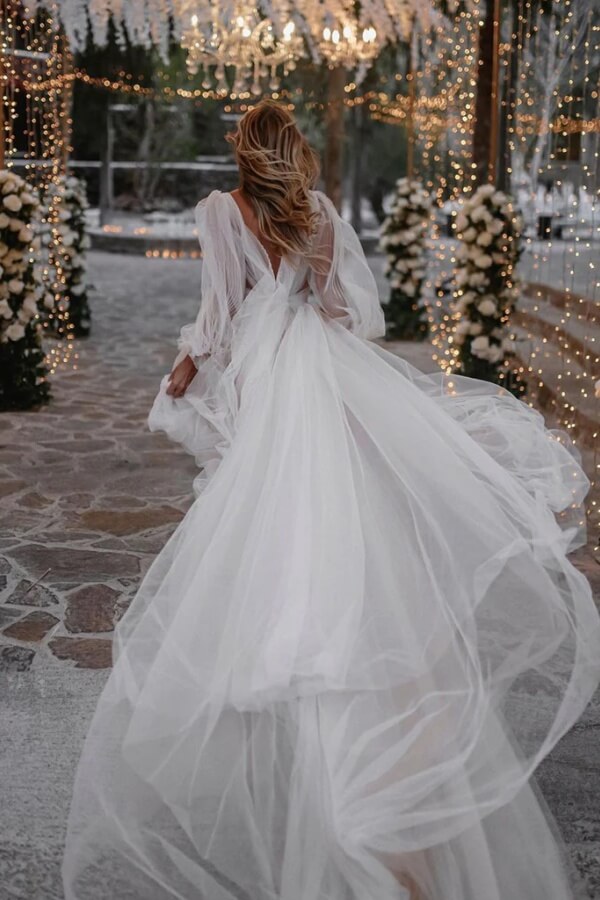 Tulle A-line Deep V-neck Long Sleeves Bohemian Wedding Dresses.