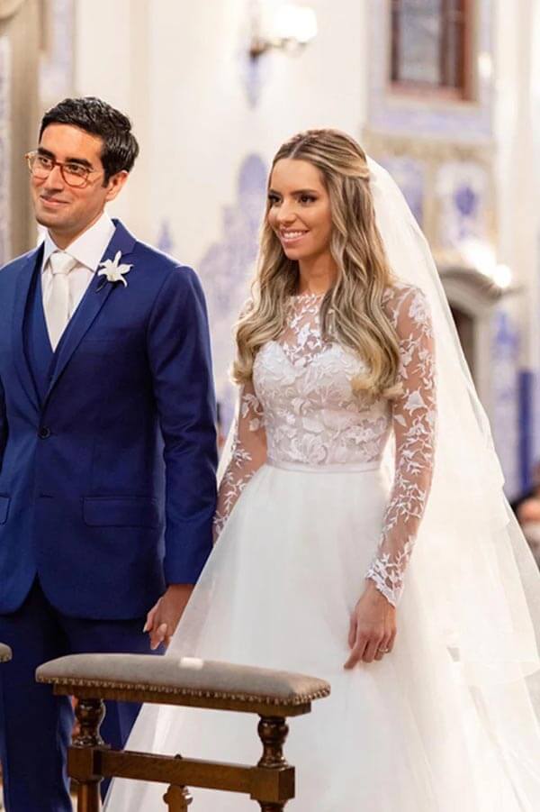 Tulle A-line Illusion Floral Lace Long Sleeves Wedding Dresses. Bridal Gown.