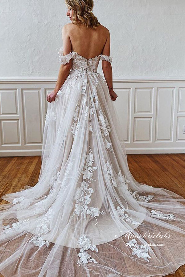 Tulle A-line Off Shoulder Sweetheart Floral Lace Beach Wedding Dresses.