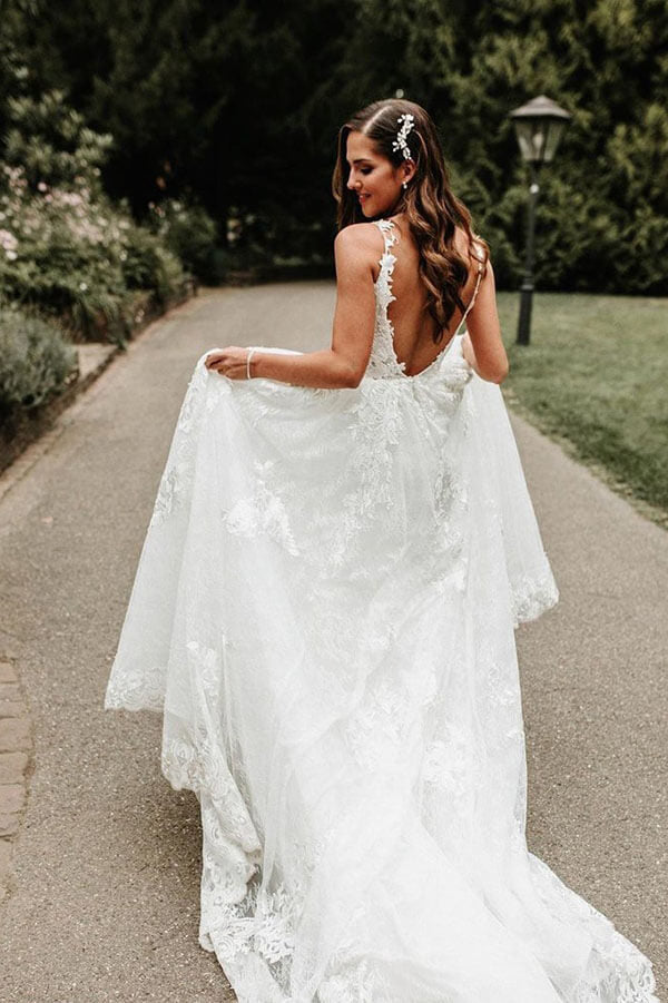 Tulle Lace A-line V-neck Chapel Train Wedding Dresses. Bridal Gowns.