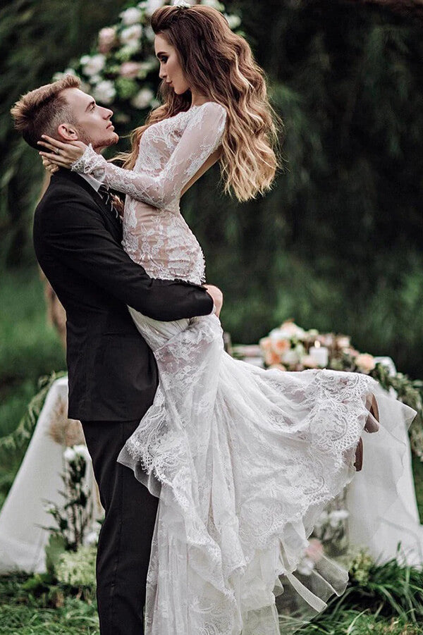 Tulle Mermaid Backless Long sleeves Lace Wedding Dresses With Train.