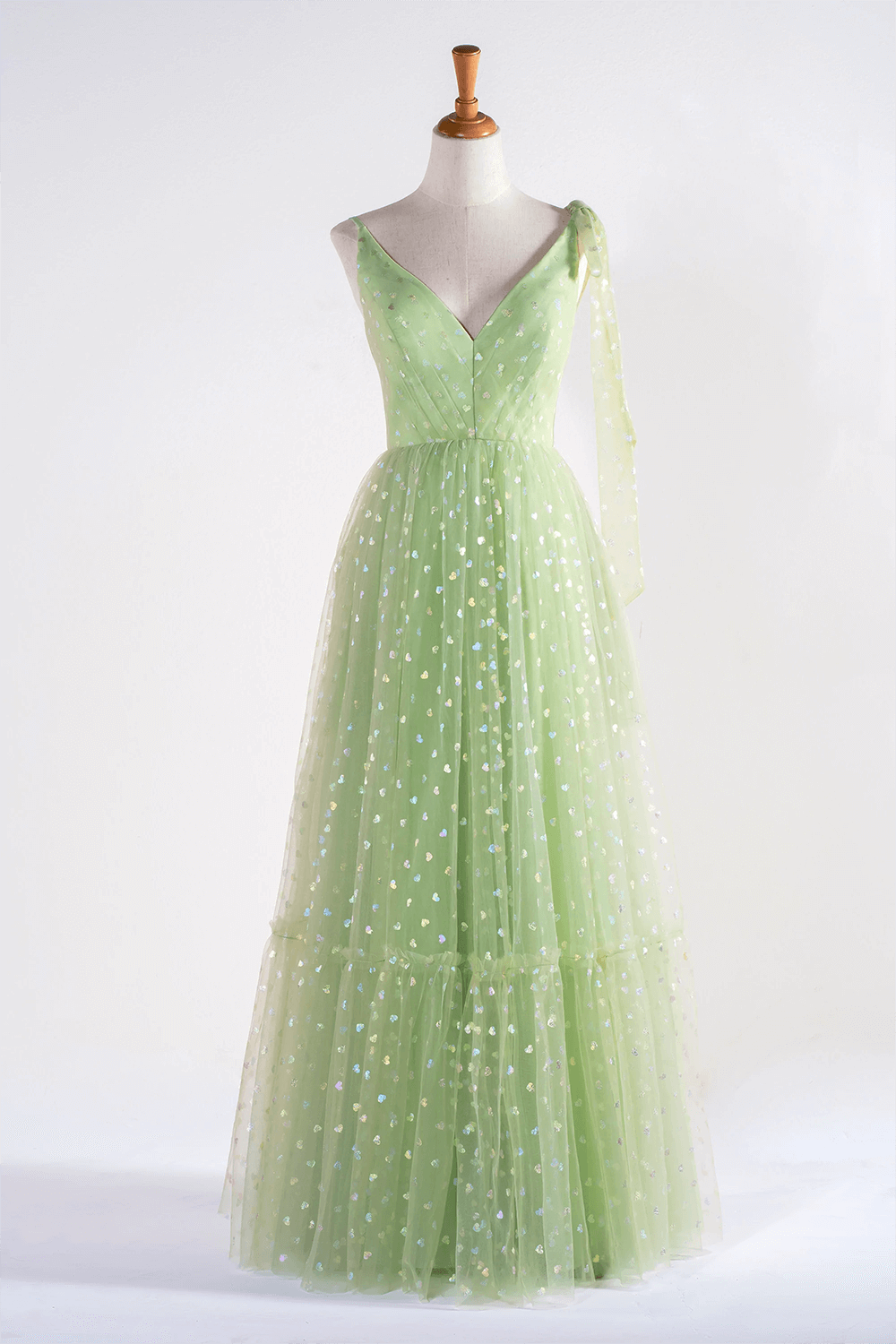 Looking for something unique for your prom This V Neck floor-length tulle green prom dress from KissProm is perfect for making a statement! The A-line silhouette is flattering for any figure. and the zipper low back adds a touch of drama. The ruffles give the dress an extra bit of flair. making it sure to turn heads on your big night.