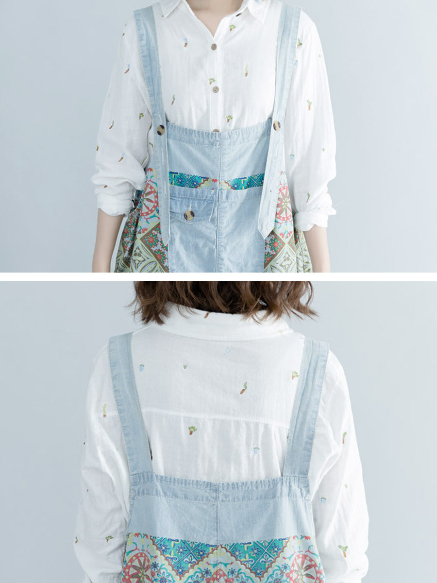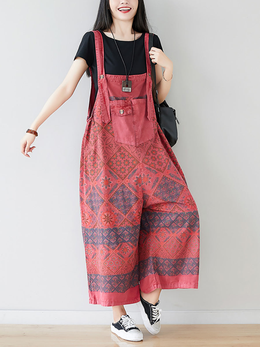 Women Ethnic Print Pocket Button Loose Wide-leg Jumpsuits