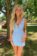 Evoke unmatched allure with Annora. A harmonious blend of sapphire blue and blush pink sequins. this bodycon dress promises to be the night's sensation. The deep V-neckline flatters. drawing attention to graceful collarbones. while its sleeveless cut ensures you remain the embodiment of sophisticated cool. To finish. the sleek zipper back offers a seamless fit. ensuring you feel as captivating as you look.