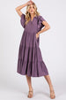 A ruffle sleeve collared V-neck tiered midi dress is a stylish and feminine dress with charming details. The ruffle sleeves add a touch of elegance and movement to the dress. while the collared V-neckline adds a polished and sophisticated touch. The tiered design creates a layered and textured look. adding dimension and visual interest to the dress. The midi length falls below the knee. making it versatile for both casual and more dressed-up occasions. This type of dress is a fashionable choice for a chic and trendy outfit. perfect for adding a touch of flair to your wardrobe.