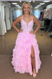 Embrace the essence of romantic allure in the Tiffany Pink Plunging V Ruffles Floral Long Prom Dress. a creation that's both ethereal and elegant. The dress features an enchanting pink tulle fabric. flowing gracefully to floor length and adorned with multi-tiered ruffles for a breathtaking silhouette. The plunging V-neck. supported by delicate spaghetti straps. offers a daring yet sophisticated look. Sleeveless in design. it's perfect for showcasing a delicate bracelet or watch. With a seamless zipper back for ease and comfort. Tiffany is an ideal choice for those seeking to blend classic elegance with a touch of modern flair at their prom or special event.