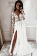 Simple A-line V-neck Open Back Long Sleeves Lace Wedding Dresses with Split.MW410